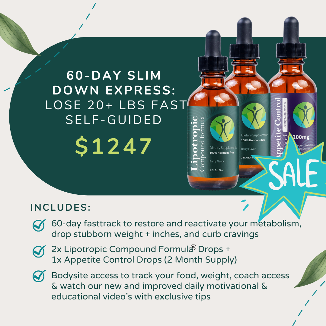 - 2x Lipotropic Compound Formula Drops + 1x Appetite Control Drops (2 Month Supply).
