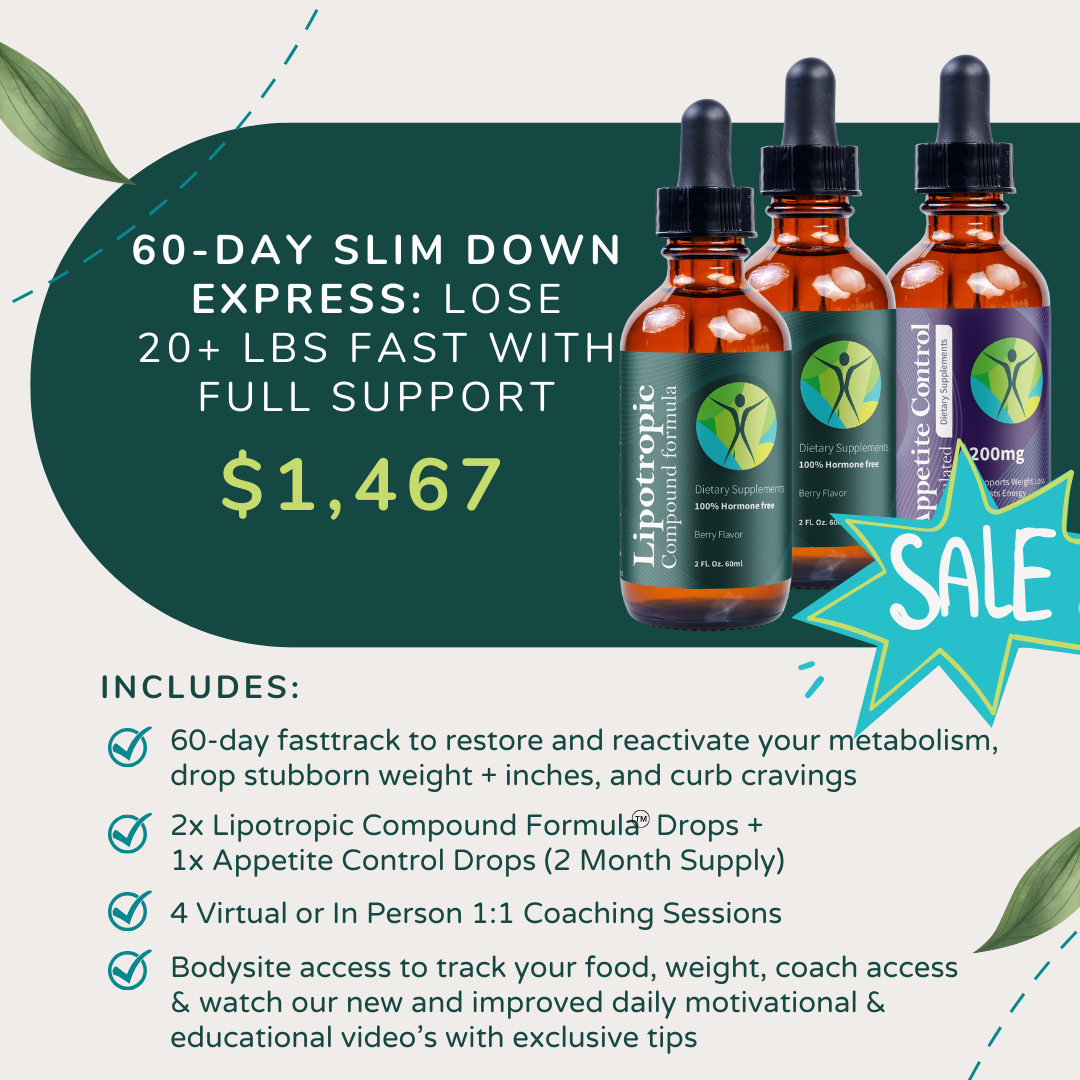 - 2x Lipotropic Compound Formula Drops + 1x Appetite Control Drops (2 Month Supply).